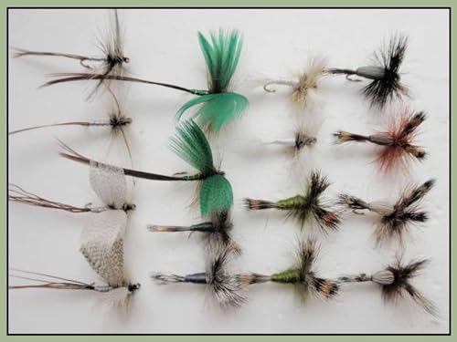 16 Maifliegen, ohne Widerhaken, grün/graue Drachen, Wulff, Humpys, Größe 10, Frühsaison-Spitzenfliegen, Mai und Juni Must Haves. Das perfekte Zubehör für jeden Angler, der in der Frühlingssaison auf den großen Fang hofft.