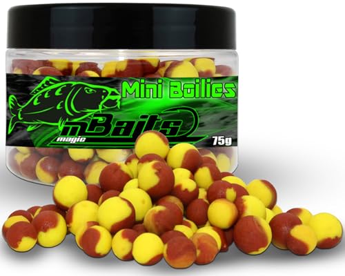 Die 2-farbigen Mini-Boilies verstärken die visuellen Reize, die den Fisch zum Anbiss verleiten, und erhöhen somit die Fangchancen. Die Packung enthält 75g Mini Boilies mit einem Durchmesser von 8/10mm, die einen Mix aus beiden Größen bieten und somit vielseitig einsetzbar sind; zudem besitzen sie sinkende Eigenschaften für eine effektive Köderpräsentation.