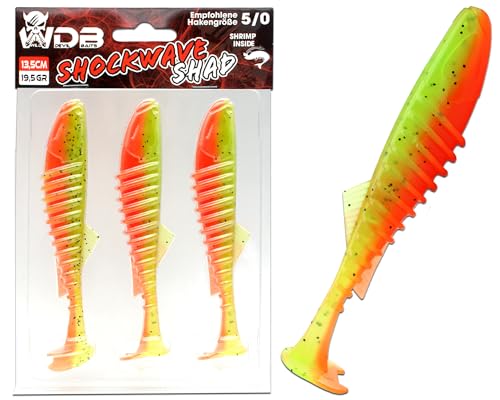 Die Wild Devil Baits Shockwave Shads sind in perfekter Größe. Es gibt zwei Größe verfügbar: 13,5 cm (19,5g) mit 5/0 Jigkopf (3 Stück) und 10,0 cm (9g) mit 3/0 Jigkopf (4 Stück).