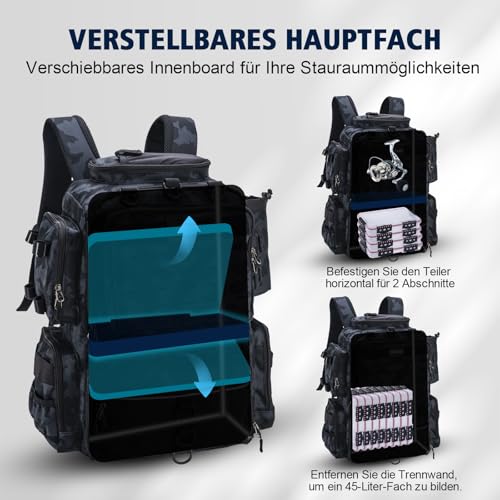 Der Rucksack verfügt über ein verstellbares Hauptfach mit einer faltbaren gepolsterten Trennwand, die Ihnen die Möglichkeit gibt, den Innenraum nach Ihren Wünschen zu gestalten. Lagern Sie Kleidung und Snacks im oberen Fach und bis zu vier Angelboxen im unteren Fach. Ein speziell entworfener Köderaufbewahrungssystem mit 8 PVC-Taschen ermöglicht einen schnellen Zugang zu Ihrem Köder und hält alles übersichtlich.