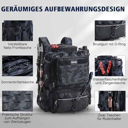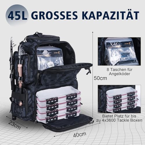 Der Goture Angelrucksack ist das ideale Accessoire für alle, die leidenschaftlich gerne angeln oder die Natur entdecken. Mit einem beeindruckenden Fassungsvermögen von 45 Litern und einer robusten Bauweise bietet dieser Rucksack nicht nur Platz für Ihr gesamtes Angelzubehör, sondern sorgt auch dafür, dass alles sicher und organisiert verstaut werden kann.