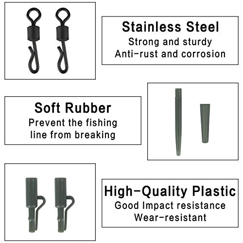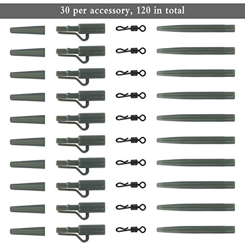 Das Set umfasst 30 Kunststoff Blei Clips, 30 Anti Tangle Ärmeln, 30 Schwanzgummis und 30 Wechselwirbel. Diese vielseitigen Komponenten sind ideal, um Ihre Angelausrüstung individuell anzupassen und Ihre Fangchancen deutlich zu erhöhen.