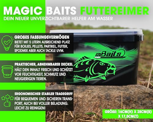 Der Magic Baits Angeleimer Boilie Bait Bucket ist ein unverzichtbares Zubehör für jeden Angler, der Wert auf eine optimale Futterlagerung legt. Egal, ob Sie Boilies, Spodmixe oder Fertigfutter transportieren möchten, dieser Eimer ist die perfekte Lösung.