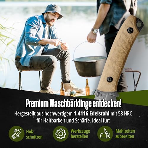 Das Messer ist extrem vielseitig und bereit für jede Herausforderung. Ob beim Schneider von Seilen, Schnitzen von Werkstücken oder als nützliches EDC – die Waschbärklinge meistert jede Aufgabe mit Bravour. Es ist nicht nur ein praktisches Camping-Messer, sondern auch ein ausgezeichnetes Anglermesser.