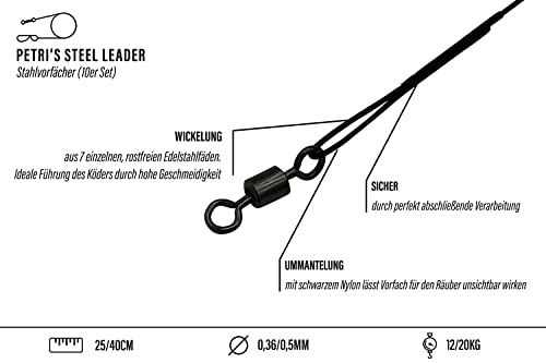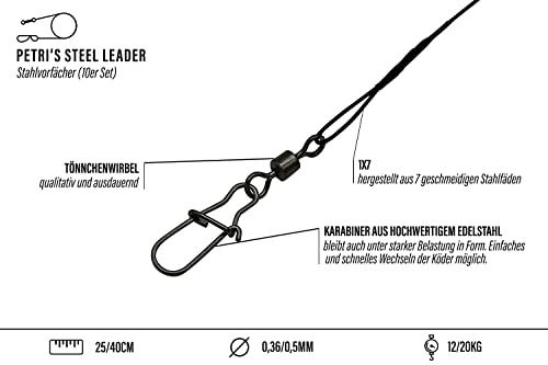 Das PetrisCatch 10er Set Stahlvorfächer mit Karabiner ist die ideale Lösung für Angler, die auf der Suche nach zuverlässiger Ausrüstung sind. Mit einer Länge von 40 cm und einer Tragkraft von 12 kg bieten diese Vorfächer auch bei starken Kräften optimale Sicherheit und Haltbarkeit.