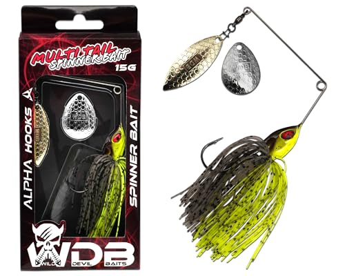 Das Wild Devil Baits Multi Tail Spinnerbait ist ein wahres Allroundtalent, wenn es darum geht Hechte und Barsche zu überlisten. Mit seinem speziellen Aufbau kann er hängerfrei und problemlos an Seerosen, Krautfeldern und Schilfkanten eingesetzt werden – wo die Raubfische auf Ihre Beute warten.