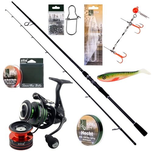 Zite Fishing Inzite Base Stick Hecht-Set | 255 cm Angelrute + Spinning Base Reel 4000 | Monofile + geflochtene Schnur | Inkl. Angelzubehör wie Snaps und Jighaken | Gummifisch Flanker Flashy Pike 18 cm