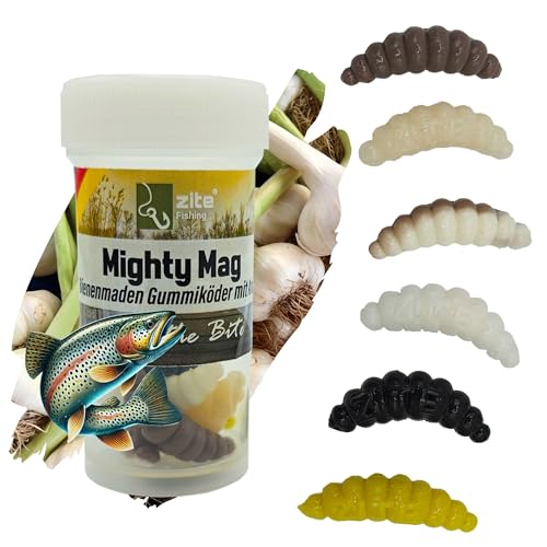 Zite Fishing Mighty Mag Nature Mix 12 STK – Bienenmaden Imitat Forellenköder 2,8cm – Gummiköder Forellen-Angeln – Phthalatfrei – Natur Knoblauch